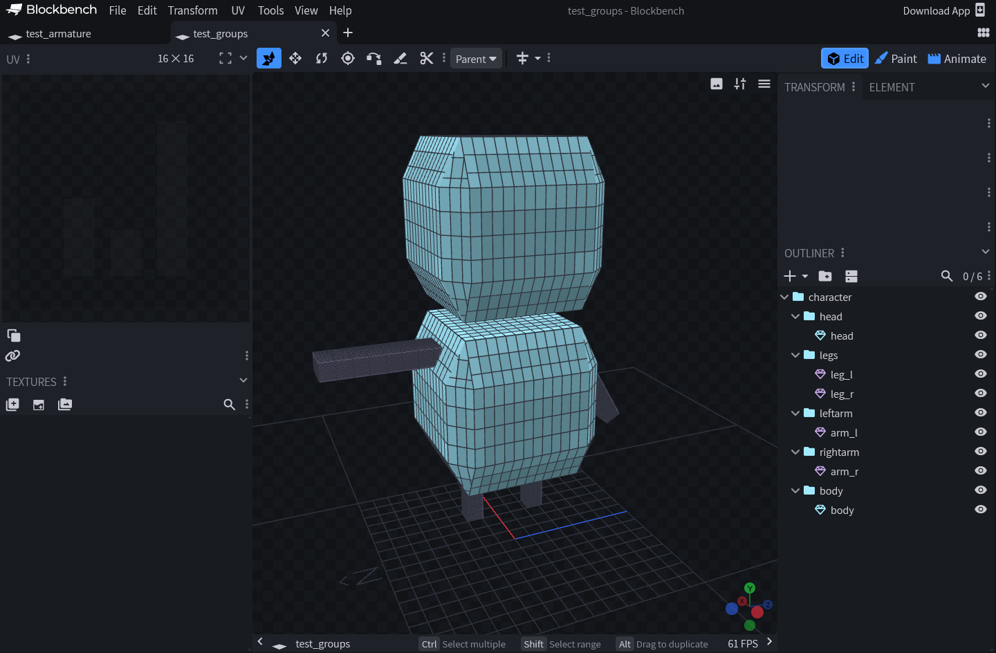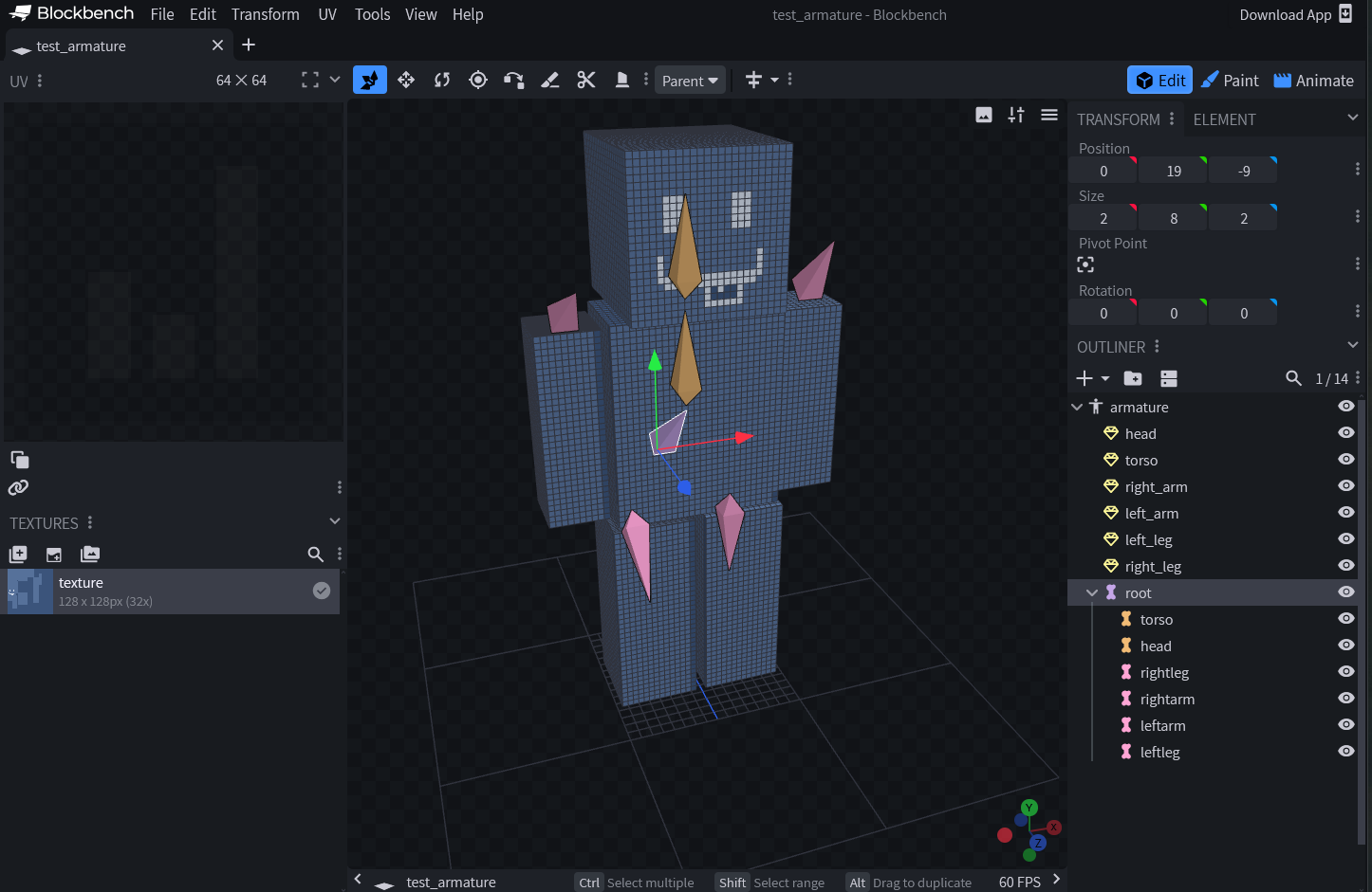 There are 2 ways to animate in Blockbench. One is using armatures with weight painting. The other way is using groups as transform pivot. Lets go through each setup in Blockbench then go over how to use them in Defold. Also note that in defold we have z as our forward axis you can keep this in mind while working in blockbench to match.