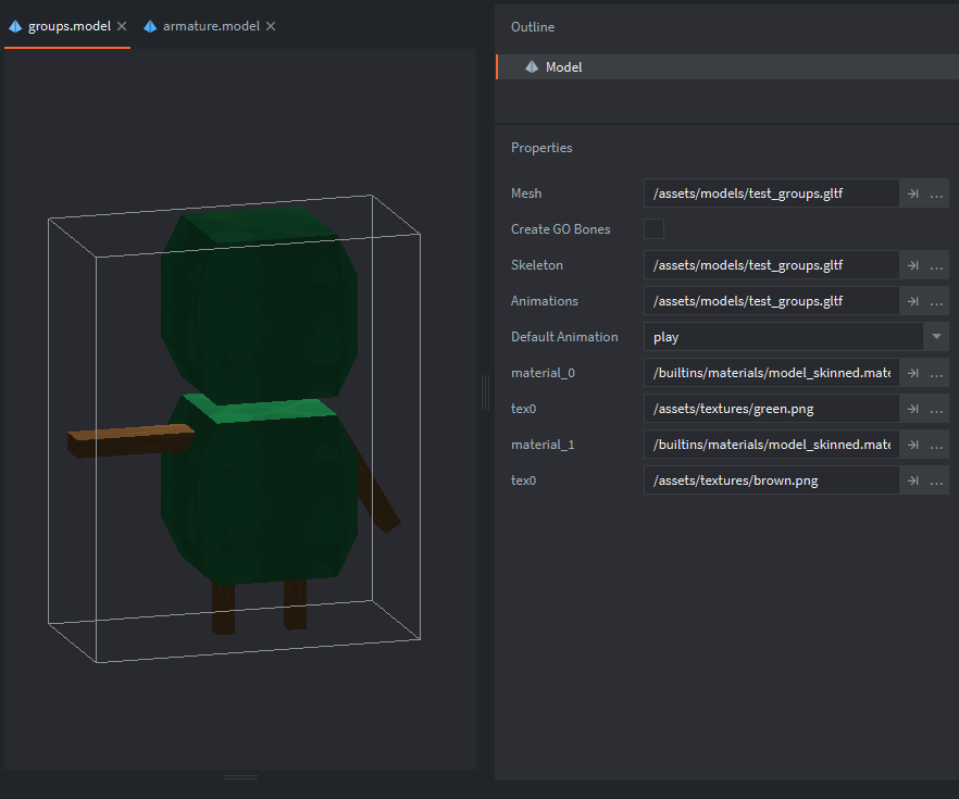 Groups in Blockbench are basically pivot points for mesh object(s) that can be animated. When we set them up in Blockbench for use in defold we need to follow the same hierarchy rule as armatures so we create a “root” group, in the example image its named as “character”. Then all grouped mesh parts we also want to animate are added to the root group. This keeps the exact same structure as the armature and will work when we bring it into defold. This method its a bit more simple and just transform animation because each group gets a full weight value automatically assigned to mesh objects in them. For more elaborate animation rigs use armatures and weight painting instead. Now when exporting the settings should be the same except now we want to check “Export Groups As Armature” and thats it! now add it to your project.