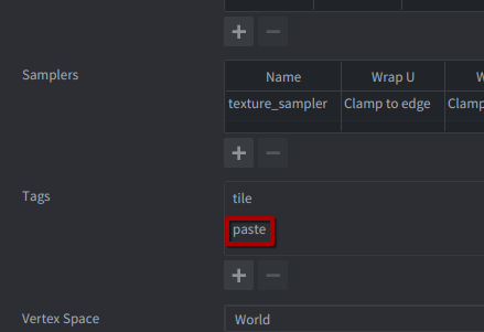 Now go to your player game object, and set the sprite to use a new material - just copy the default sprite material from the builtins folder, and add a new tag: “paste”