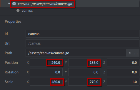 Note: If the game is running at the full 1920x1080 resolution, everything is aligned, but if you resize the window, the canvas output is off - right size just wrong position. This can probably be solved by making sure the quad is repositioned to compensate, you could do this on a window resize event in a game object script. At the time of writing I haven’t got around to dealing with this yet, but it shouldn’t be too hard. I just think the solution will be in game object scripts, not the render script, since we want to keep everything in the game’s own world space to keep everything aligned, and not mess with any view matrices like in the Post Processing example.