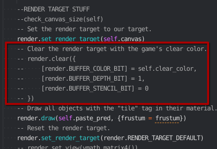 However, we can’t just clear the canvas in the on_message() function of the render script, since render commands only work during the update function. So we will set a boolean instead, and re-instate the clear command in the update function, and conditionally clear it based on this boolean;