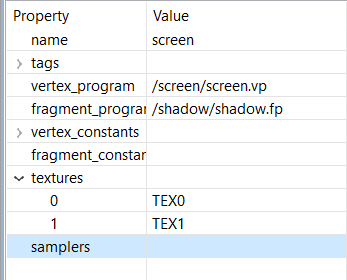 Also, I noticed that you are not using the “shadow.material” that you think you are (you have 2). So, in the screen/shadow.material, you probably want to add another texture (as your previous picture suggests), and the shadow.material doesn’t use shadow.fp. But even after fixing that, I get the same error in the console. Unfortunately, I don’t have more time to spend right now (off for christmas vacation)