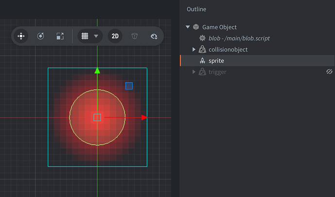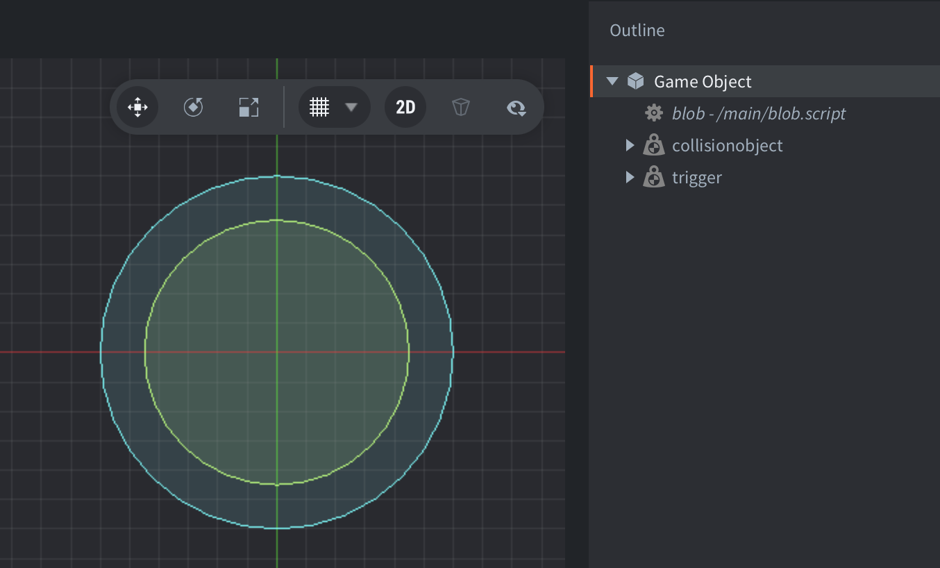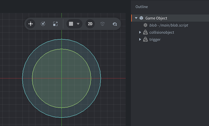 Each blob the game drops is actually made of 4 separate “ball” game objects. The balls have 2 collision objects, one of type Dynamic to control their movement and collisions, and one slightly bigger of type Trigger used in the linking process. Each trigger is assigned a certain physics group and mask, corresponding to the different blob colors. Once a trigger event fires, I create_joint