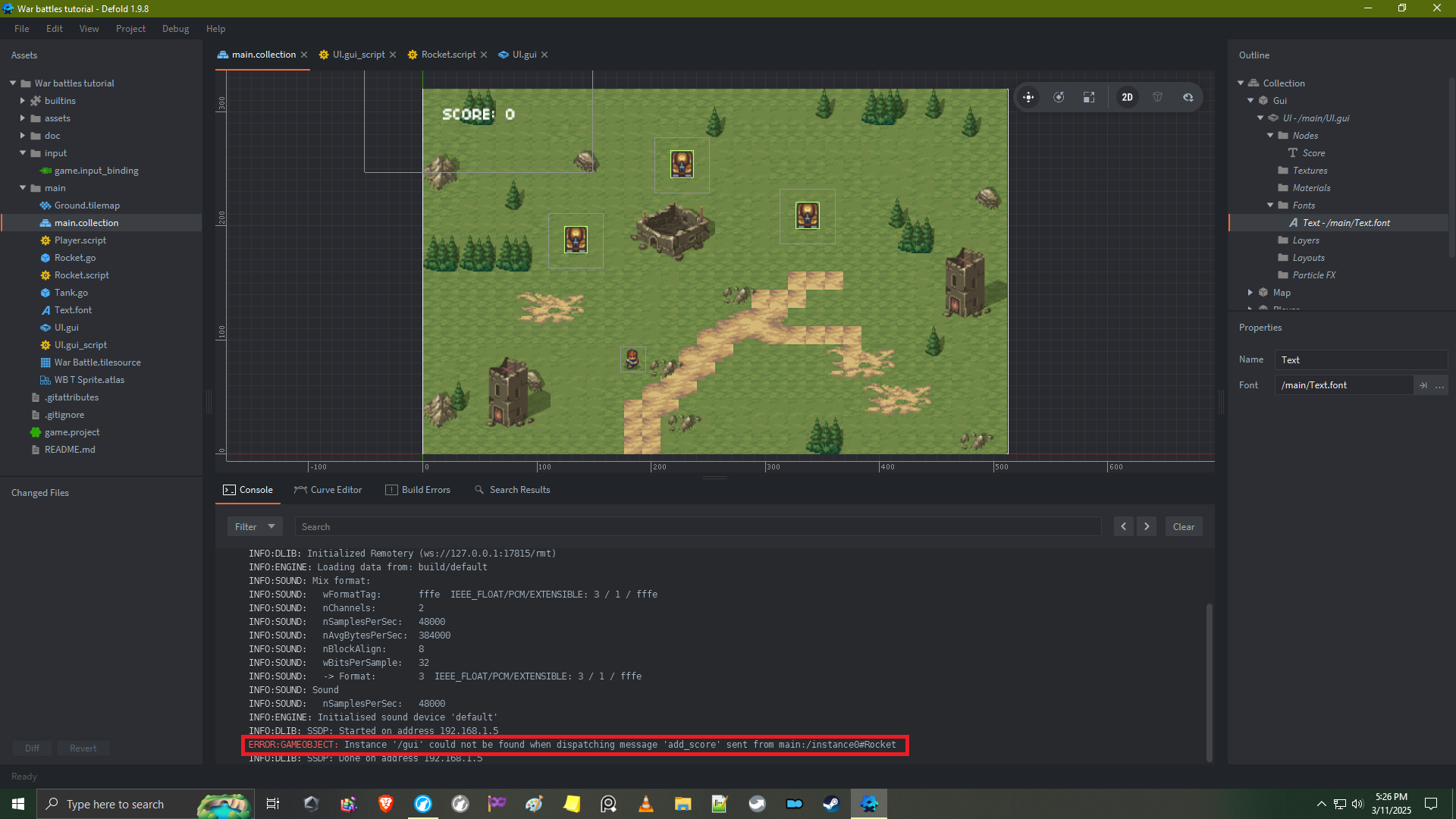 ERROR:GAMEOBJECT: Instance ‘/gui’ could not be found when dispatching message ‘add_score’ sent from main:/instance0#Rocket
